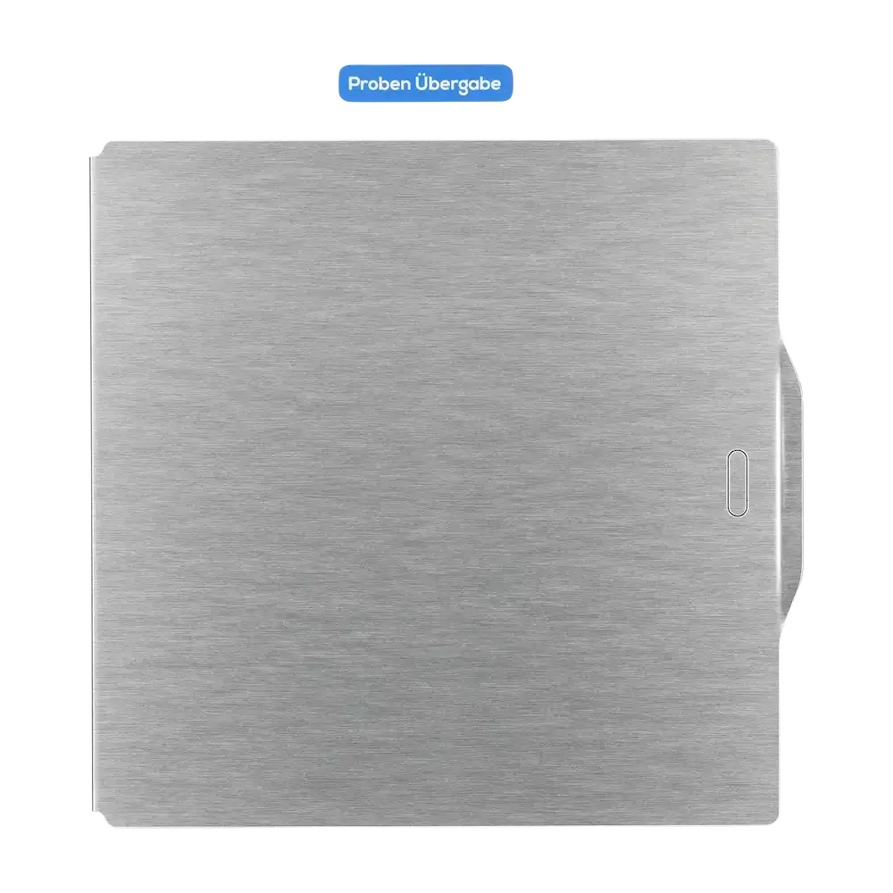 Die sichtbare Oberfläche wirkt wie gebürsteter Edelstahl. Basis ist eine DIBOND®-Aluminiumverbundplatte mit BUTLERFINISH Oberfläche, charakteristischer Schliffstruktur und klarlackveredelter, metallischer Optik. Das verleiht der Durchreiche ein modernes, technisches Erscheinungsbild und passt besonders gut in designorientierte Praxis- und Laborumgebungen. Die fugenlose Konstruktion unterstützt gleichzeitig eine einfache Reinigung und dauerhaft hohe Hygienestandards.